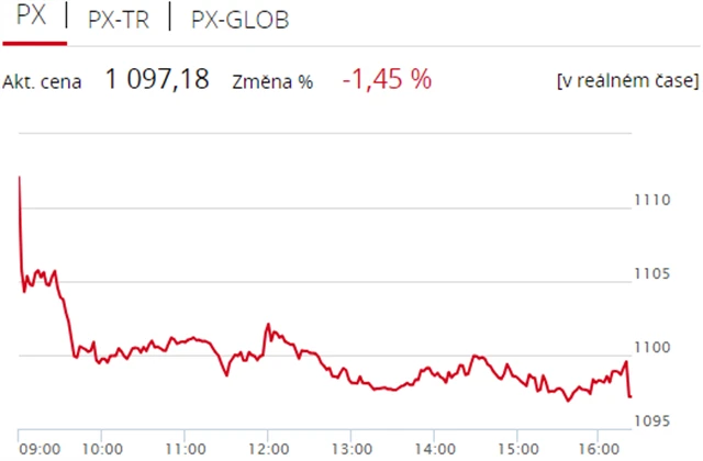 V červených číslech dále uzavřely mediální CME (-2,98 % na 84,60 Kč), energetická skupina ČEZ (-1,08 % na 548 Kč), tabáková firma Philip Morris ČR (-0,87 % na 15 860 Kč), likérka Stock Spirits (-0,66 % na 75,70 Kč) a petrochemický holding Unipetrol (-0,4 % na 371 Kč).