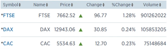 Regionální index STOXX Europe 600 vzrostl o 0,57 % na 392,24 bodu, britský FTSE 100 si připsal 1,28 % na 7 662,52 bodu, francouzský CAC 40 získal 0,23 % na 5 534,63 bodu a německý DAX stoupl o 0,24 % na 12 943,06 bodu.
