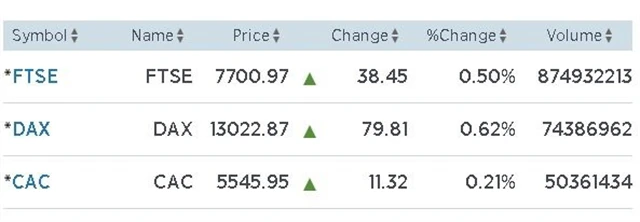 Celoevropský index STOXX Europe 600 klesl o 0,12 %, britský FTSE 100 si připsal 0,5 %, francouzský CAC 40 si polepšil o 0,21 % a německý DAX uzavřel se ziskem 0,62 % na 13 022,87 bodu. Nad psychologicky důležitou úroveň 13 000 bodů se DAX dostal poprvé od začátku února. Index FTSE 100 se pak vyšplhal na nejvyšší úroveň za tři a půl měsíce.
