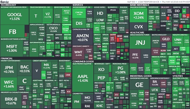 Index Dow přidal 0,8 % na 24 739,53 bodu, širší S&P 500 se zvýšil o 0,94 % na 2 723,07 bodu a index technologického trhu Nasdaq Composite se zvýšil o 0,89 % na 7 404,97 bodu. Index volatility VIX se snížil o 1,42 % na 13,23 bodu a výnos 10letých vládních dluhopisů USA klesl o více než čtyři bazické body na 2,962 %.