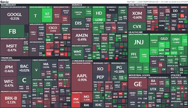 Index Dow v pátek vzrostl o 0,37 % na 24 831,17 bodu a širší index S&P 500 se zvýšil o 0,17 % na 2 727,72 bodu, zatímco index technologického trhu Nasdaq Composite se snížil o 0,03 % na 7 402,88 bodu. Index volatility VIX klesl o 4,38 % na 12,65 bodu a výnos 10letých vládních dluhopisů USA se zvýšil o necelý jeden bazický bod na 2,968 %.