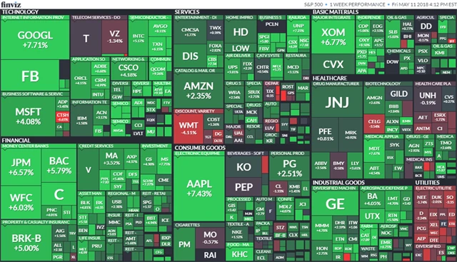 Za celý týden všechny tři hlavní indexy stouply, Dow o 2,3 %, S&P 500 o 2,4 % a Nasdaq Composite o 2,7 %.