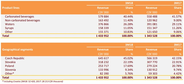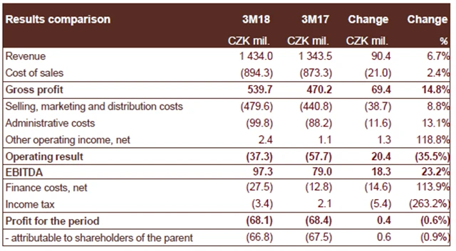 Zisk EBITDA skupině v Česku vyskočil na 64,99 milionu z 21,42 milionu Kč, na Slovensku klesl na 38,11 milionu z 53,14 milionu Kč, ve Slovinsku se zvýšil na 10,28 milionu z 6,57 milionu Kč a v Polsku společnost spadla do ztráty 791 tisíc Kč po zisku 6,83 milionu Kč. Marže EBITDA se celkově zvýšila z 5,88 % na 6,78 %, pozitivně ji ovlivnil pokles ceny cukru a silné prodeje značek Kofola a Rauch.