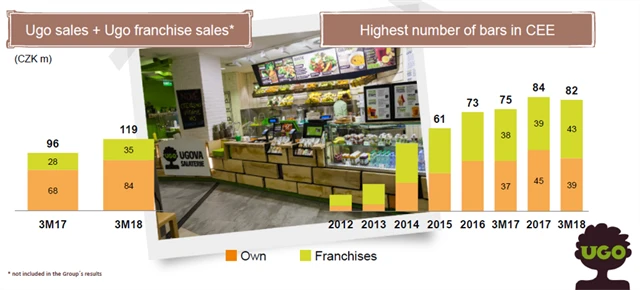 Velmi dobře opět vyzněly výsledky fresh barů a salaterií UGO. Tržby v tomto segmentu, včetně prodeje produktů UGO mimo stejnojmenné provozovny, stouply meziročně na 119 milionů z 96 milionů korun. Celkový počet provozoven UGO se meziročně zvýšil o sedm, proti konci loňského roku ale o dvě klesl.