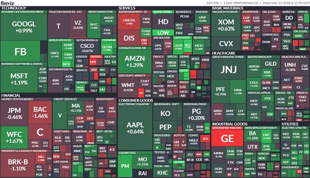 Americké akcie měly ve středu tendenci oslabovat pod vlivem komentáře prezidenta USA Donalda Trumpa, který zchladil optimismus ohledně pokroku v obchodních jednáních s Čínou. Po zveřejnění zápisu ze zasedání centrální banky USA ale ztráty vyrovnaly. (23. 5. 2018)