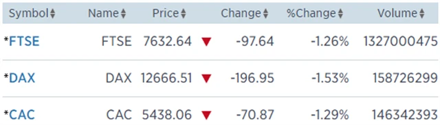 Regionální index STOXX Europe 600 přišel o 1,38 % na 384,44 bodu, britský FTSE 100 klesl o 1,26 % na 7 632,64 bodu, francouzský CAC 40 oslabil o 1,29 % na 5 438,06 bodu a německý DAX odevzdal 1,53 % na 12 666,51 bodu.
