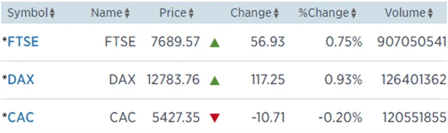 Regionální index STOXX Europe 600 zpevnil o 0,03 % na 384,59 bodu, britský FTSE 100 získal 0,75 % na 7 689,57 bodu, francouzský CAC 40 klesl o 0,2 % na 5 427,35 bodu a německý DAX si polepšil o 0,93 % na 12 783,76 bodu. Index italských akcií FTSE MIB po výrazných propadech z předcházejících dvou seancí stoupl o 2,09 % na 21 797,82 bodu.