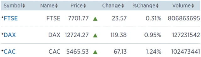 Regionální index STOXX Europe 600 stoupl o 1,01 % na 386,91 bodu, za celý týden však odevzdal 2,05 %. Britský FTSE 100 vzrostl o 0,31 % na 7 701,77 bodu (týden: -0,67 %), francouzský CAC 40 posílil o 1,24 % na 5 465,53 bodu (týden: -2,6 %) a německý DAX získal 0,95 % na 12 724,27 bodu (týden: -2,57 %).