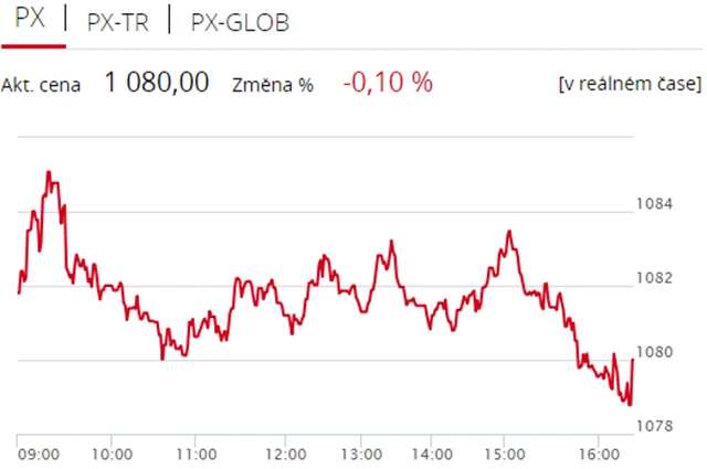 Pražská burza začala nový týden v červených číslech, když index PX odepsal 0,1 % na 1 080 bodů. Dolů ji stáhly zejména akcie Erste Group Bank a pojišťovny VIG, o více než procento naopak stouply cenné papíry energetické skupiny ČEZ. Objem obchodů byl s 426 miliony korun podprůměrný.