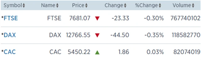 Regionální index STOXX Europe 600 odepsal 0,21 % na 385,12 bodu, za celý týden pak ztratil 0,25 %. Britský FTSE 100 klesl o 0,3 % na 7 681,7 bodu (týden: +0,03 %), francouzský CAC 40 vzrostl o 0,03 % na 5 450,22 bodu (týden: -0,31 %) a německý DAX odevzdal 0,35 % na 12 766,55 bodu (týden: +0,68 %).