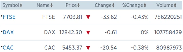 Regionální index STOXX Europe 600 odepsal 0,02 % na 387,85 bodu, britský FTSE 100 klesl o 0,43 % na 7 703,81 bodu, francouzský CAC 40 přišel o 0,38 % na 5 435,37 bodu a německý DAX uzavřel bez procentuální změny na 12 842,3 bodu.