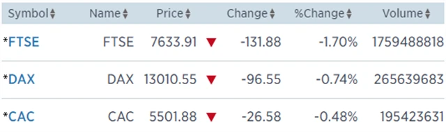 Regionální index STOXX Europe 600 odepsal 0,84 % na 389,75 bodu, za celý týden však stoupl o 2,06 %. Britský FTSE 100 přišel o 1,7 % na 7 633,91 bodu (týden: +1,1 %), francouzský CAC 40 klesl o 0,48 % na 5 501,88 bodu (týden: +1,44 %) a německý DAX ztratil 0,74 % na 13 010,55 bodu (týden: +2,67 %).