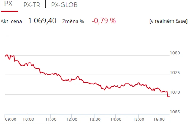 Pražská burza v pondělí nenavázala na zisk ze závěru minulého týdne, když index PX odevzdal 0,79 % na 1 069,4 bodu. Dolů burzu stáhly zejména akcie Erste Group Bank a energetické skupiny ČEZ, proti trendu šly pouze cenné papíry O2 Czech Republic a tabákové firmy Philip Morris ČR. Objem obchodů byl s 277 miliony korun výrazně podprůměrný.