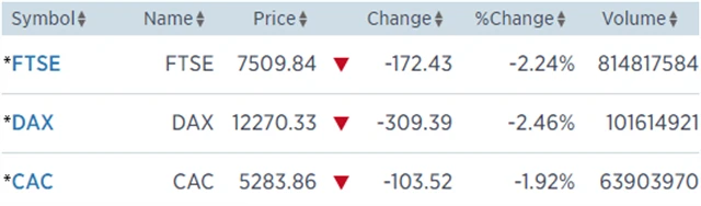 Regionální index STOXX Europe 600 spadl o 2,07 % na 377,05 bodu, britský FTSE 100 odepsal 2,24 % na 7 509,84 bodu, francouzský CAC 40 klesl o 1,92 % na 5 283,86 bodu a německý DAX oslabil o 2,46 % na 12 270,33 bodu.