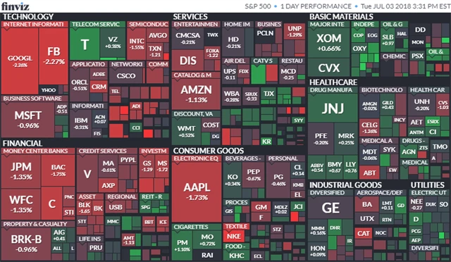 Index Dow odepsal 0,54 % na 24 174,82 bodu, širší index S&P 500 klesl o 0,49 % na 2 713,22 bodu a index technologického trhu Nasdaq Composite ztratil 0,86 % na 7 502,67 bodu. Index volatility VIX se zvýšil o 3,46 % na 16,14 bodu a výnos 10letých vládních dluhopisů USA klesl o zhruba čtyři bazické body na 2,83 %.