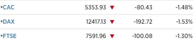 Regionální index STOXX Europe 600 přišel o 1,26 % na 381,4 bodu, britský FTSE 100 ztratil 1,3 % na 7 591,96 bodu, francouzský CAC 40 klesl o 1,48 % na 5 353,93 bodu a německý DAX odevzdal 1,53 % na 12 417,13 bodu.
