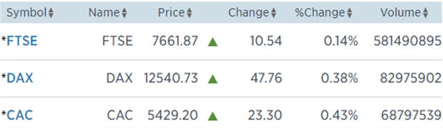 Regionální index STOXX Europe 600 stoupl o 0,22 % na 385,21 bodu, za celý týden si pak připsal zhruba 0,7 %. Britský FTSE 100 vzrostl o 0,14 % na 7 661,87 bodu (týden: +0,6 %), francouzský CAC 40 zpevnil o 0,43 % na 5 429,2 bodu (týden: +1 %) a německý DAX posílil o 0,38 % na 12 540,73 bodu (týden: +0,4 %).