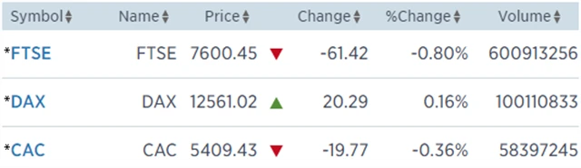Regionální index STOXX Europe 600 odepsal 0,19 % na 384,29 bodu, britský FTSE 100 přišel o 0,8 % na 7 600,45 bodu, francouzský CAC 40 klesl o 0,36 % na 5 409,43 bodu a německý DAX stoupl o 0,16 % na 12 561,02 bodu.