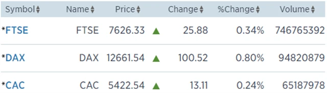 Regionální index STOXX Europe 600 zpevnil o 0,31 % na 385,23 bodu, britský FTSE 100 stoupl o 0,34 % na 7 626,33 bodu, francouzský CAC 40 vzrostl o 0,24 % na 5 422,54 bodu a německý DAX získal 0,8 % na 12 661,54 bodu.