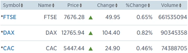 Regionální index STOXX Europe 600 vzrostl o 0,57 % na 387,16 bodu, britský FTSE 100 získal 0,65 % na 7 676,28 bodu, francouzský CAC 40 stoupl o 0,46 % na 5 447,44 bodu a německý DAX si polepšil o 0,82 % na 12 765,94 bodu.