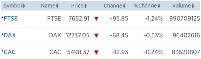 Regionální index STOXX Europe 600 přišel o 0,45 % na 389,86 bodu, britský FTSE 100 odepsal 1,24 % na 7 652,91 bodu, francouzský CAC 40 ztratil 0,24 % na 5 498,37 bodu a německý DAX klesl o 0,53 % na 12 737,05 bodu.