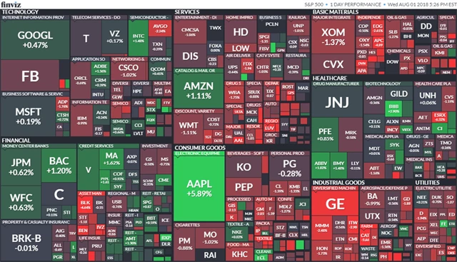 Akcie Applu (+5,89 %) ve středu stouply o bezmála šest procent na rekordních 201,50 USD. Firmě pomohly výsledky hospodaření za druhé čtvrtletí, které zveřejnila v úterý po uzavření trhů, zvláště pak výhled dalšího růstu. Apple se tak přiblížil okamžiku, kdy by jeho tržní kapitalizace mohla překonat bilion dolarů.