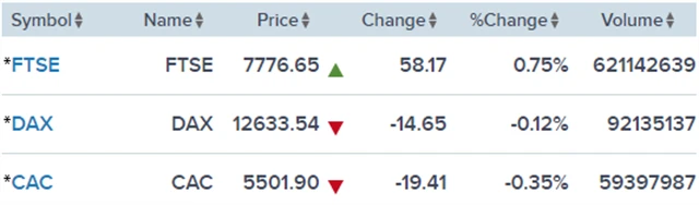 Regionální index STOXX Europe 600 odepsal 0,23 % na 389,58 bodu, britský FTSE 100 vzrostl o 0,75 % na 7 776,65 bodu, francouzský CAC 40 klesl o 0,35 % na 5 501,9 bodu a německý DAX ztratil 0,12 % na 12 633,54 bodu.