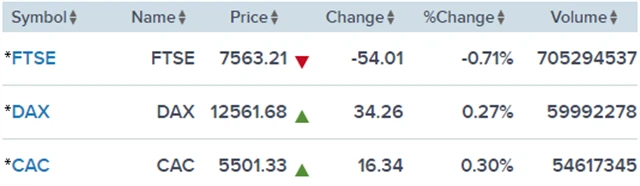 Regionální index STOXX Europe 600 zpevnil o 0,29 % na 386,58 bodu. Britský FTSE 100 klesl o 0,71 % na 7 563,21 bodu poté, co agentura Bloomberg přinesla zprávu, že jednání o brexitu postupují pomaleji, než se čekalo, což znamená, že k dosažení dohody mezi oběma stranami dojde pravděpodobně až v závěru roku. Francouzský CAC 40 získal 0,3 % na 5 501,33 bodu a německý DAX stoupl o 0,27 % na 12 561,68 bodu.