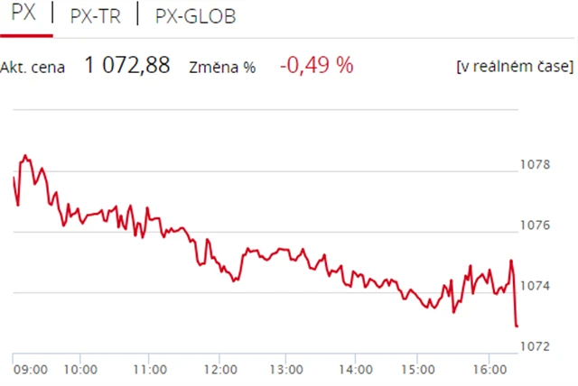 Pražská burza v pátek potřetí v řadě uzavřela v mínusu, když index PX odepsal 0,49 % na 1 072,88 bodu. Dolů burzu stáhly zejména akcie Erste Group Bank a energetické skupiny ČEZ, dařilo se naopak likérce Stock Spirits a telefonnímu operátorovi O2 Czech Republic. Objem obchodů byl s necelými 598 miliony korun mírně nadprůměrný.