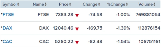 Regionální index STOXX Europe 600 přišel o 1,09 % na 375,69 bodu, britský FTSE 100 klesl o 1 % na 7 383,28 bodu, francouzský CAC odevzdal 1,54 % na 5 260,22 bodu a německý DAX ztratil 1,39 % na 12 040,46 bodu.