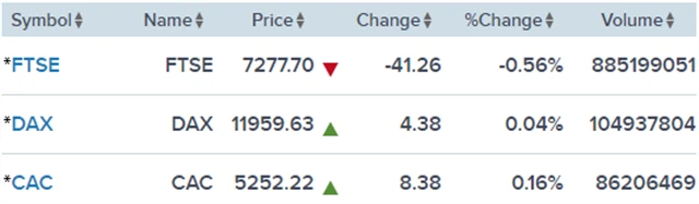 Regionální index STOXX Europe 600 zpevnil o 0,03 % na 373,57 bodu, za celý týden však spadl o 2,33 %. Britský FTSE 100 odevzdal 0,56 % na 7 277,7 bodu (týden: -2,13 %), francouzský CAC 40 stoupl o 0,16 % na 5 252,22 bodu (týden : -2,94 %) a německý DAX vzrostl o 0,04 % na 11 959,63 bodu (týden: -3,27 %).