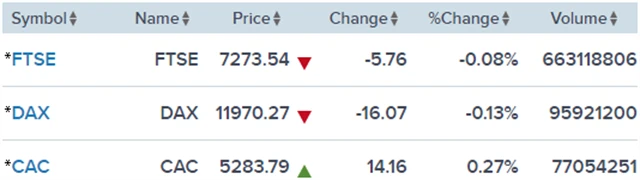 Regionální index STOXX Europe 600 odepsal 0,15 % na 374,96 bodu, britský FTSE 100 klesl o 0,08 % na 7 273,54 bodu, francouzský CAC 40 zpevnil o 0,27 % na 5 283,79 bodu a německý DAX se snížil o 0,13 % na 11 970,27 bodu.