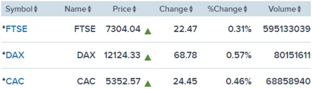 Regionální index STOXX Europe 600 stoupl o 0,35 % na 377,85 bodu, za celý týden pak získal 1,09 %. Britský FTSE 100 vzrostl o 0,31 % na 7 304,04 bodu (týden: +0,36 %), francouzský CAC 40 zpevnil o 0,46 % na 5 352,57 bodu (týden: +1,91 %) a německý DAX si polepšil o 0,57 % na 12 124,33 bodu (týden: +1,38 %).