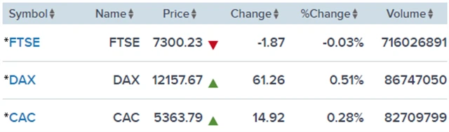 Regionální index STOXX Europe 600 zpevnil o 0,07 % na 378,56 bodu, britský FTSE 100 přišel o 0,03 % na 7 300,23 bodu, francouzský CAC 40 získal 0,28 % na 5 363,79 bodu a německý DAX vzrostl o 0,51 % na 12 157,67 bodu.