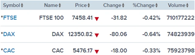 Regionální index STOXX Europe 600 ztratil 0,56 % na 382,14 bodu, britský FTSE 100 odevzdal 0,42 % na 7 458,41, francouzský CAC 40 klesl o 0,33 % na 5 476,17 bodu a německý DAX se snížil o 0,64 % na 12 350,82.
