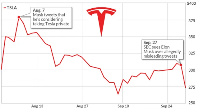 - Americká Komise pro cenné papíry a burzy (SEC) ve čtvrtek podala žalobu na generálního ředitele automobilky Tesla Elona Muska kvůli jeho prohlášením ohledně možného stažení akcií podniku z burzy. SEC obvinila Muska z podvodu a chce, aby nemohl zastávat vysokou funkci v čele Tesly, ale ani v čele žádné jiné veřejně obchodované firmy.