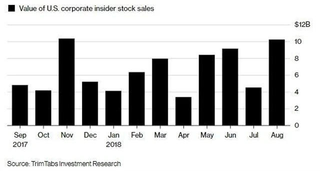 Objem prodejů akcií ze strany insiderů v srpnu stoupl na 450 milionů USD denně, což byla nejvyšší úroveň v letošním roce. Na měsíční bázi se jednalo o prodeje akcií v hodnotě zhruba 10 miliard USD. Aktuální měsíční report společnosti TrimTabs navíc ukazuje, že prodeje ze strany nejvíce informovaných obchodníků neustávají ani v září. Již 21. září se objem prodejů insiderů dostal na nejvyšší zářijovou úroveň za posledních 10 let. Děje se tak zároveň v době, kdy rekordně roste objem zpětně odkoupených akcií.