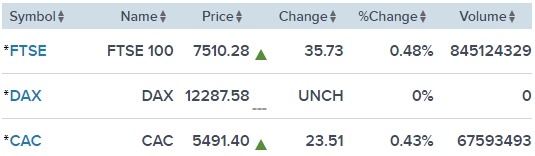 Regionální index STOXX Europe 600 vzrostl o 0,06 % na 384,15 bodu, britský FTSE 100 stoupl o 0,48 % na 7 510,28 bodu a francouzský CAC 40 posílil o 0,43 % na 5 491,4 bodu. V Německu se ve středu kvůli státnímu svátku neobchodovalo.