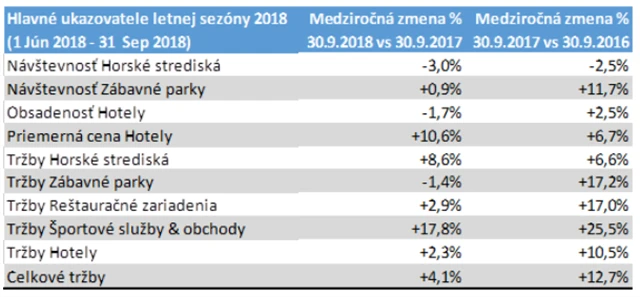 Společnosti Tatry Mountain Resorts (TMR), která je provozovatelem lyžařských středisek a zábavních parků na Slovensku, v České republice a v Polsku, v letošní letní sezóně (od 1. června do 30. září) stouply tržby meziročně o 4,1 %. Výnosy se zvýšily ve všech segmentech s výjimkou zábavních parků, které zaznamenaly 3% pokles návštěvnosti.