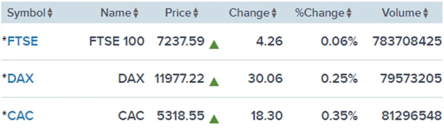 Regionální index STOXX Europe 600 získal 0,26 % na 373,17 bodu, britský FTSE 100 zpevnil o 0,06 % na 7 237,59 bodu, francouzský CAC 400 se zvýšil o 0,35 % na 5 318,55 bodu a německý DAX si polepšil o 0,25 % na 11 977,22 bodu.