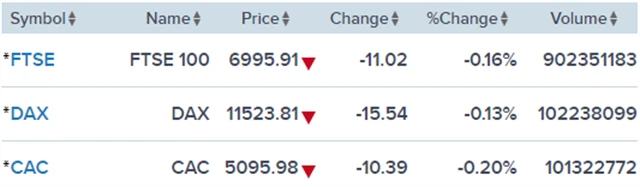 Regionální index STOXX Europe 600 oslabil o 0,19 % na 358,95 bodu, za celý týden pak spadl o 4,64 %. Britský FTSE 100 oslabil o 0,16 % na 6 995,91 bodu (týden: -4,41 %), francouzský CAC 40 odepsal 0,2 % na 5 095,98 bodu (týden: -4,91 %) a německý DAX ztratil 0,13 % na 11 523,81 bodu (týden: -4,86 %).
