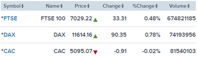 Regionální index STOXX Europe 600 získal 0,16 % na 359,52 bodu, britský FTSE 100 stoupl o 0,48 % na 7 029,22 bodu, francouzský CAC 40 odepsal 0,02 % na 5 095,07 bodu a německý DAX se zvýšil o 0,78 % na 11 614,16 bodu.