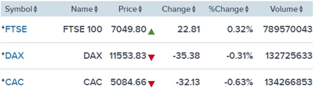 Regionální index STOXX Europe 600 odevzdal 0,12 % na 361,24 bodu, za celý týden však o 0,64 % zpevnil. Britský FTSE 100 získal 0,32 % na 7 049,8 bodu (týden: +0,77 %), francouzský CAC 40 si polepšil o 0,63 % na 5 084,66 bodu (týden: -0,22 %) a německý DAX klesl o 0,31 % na 11 553,83 bodu (týden: +0,26 %).