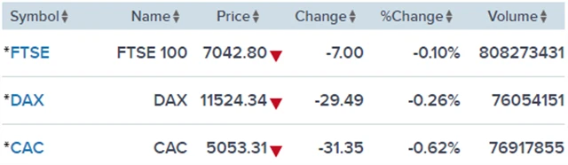 Regionální index STOXX Europe 600 odepsal 0,42 % na 359,74 bodu, britský FTSE 100 přišel o 0,1 % na 7 042,8 bodu, francouzský CAC 40 klesl o 0,62 % na 5 053,31 bodu a německý DAX oslabil o 0,26 % na 11 524,34 bodu.