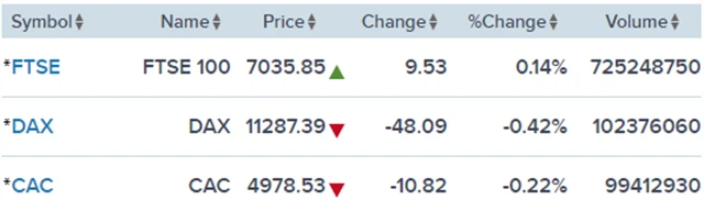 Regionální index STOXX Europe 600 zpevnil o 0,01 % na 355,53 bodu, britský FTSE 100 vzrostl o 0,14 % na 7 035,85 bodu, ale francouzský CAC 40 klesl o 0,22 % na 4 978,53 bodu a německý DAX ztratil 0,42 % na 11 287,39 bodu.
