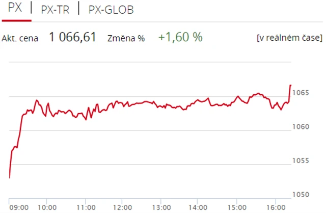 Pražská burza se ve středu odrazila od ztráty z úterního obchodování, když index PX zpevnil o 1,6 % na 1 066,61 bodu. Nahoru burzu táhly zejména akcie Erste Group Bank a Monety Money Bank, v mínusu uzavřela pouze nápojářská Kofola ČeskoSlovensko. Objem obchodů byl s 630 miliony korun nadprůměrný.