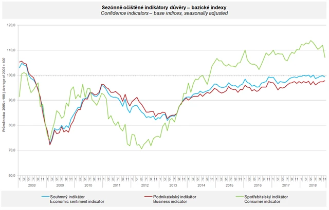 Index důvěry podnikatelů v listopadu meziměsíčně stoupl o 0,5 bodu na 97,8 bodu. Zvýšila se důvěra ve stavebnictví a vybraných službách a klesla v obchodu a průmyslu. "Spotřebitelé byli naproti tomu více pesimističtí. V listopadu vzrostly obavy ze zhoršení celkové ekonomické situace, jejich důvodem může být například sílící nejistota z dalšího ekonomického vývoje," uvedl vedoucí oddělení konjunkturálních průzkumů ČSÚ Jiří Obst. Proti říjnu index důvěry spotřebitelů klesl ze 112 bodů na 106,9 bodu.