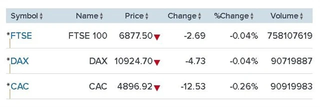 Investoři na očekávané konstatování ECB reagovali mírnou skepsí. Index britské burzy FTSE 100 skončil na červené nule (-0,04 %), stejný výsledek zaznamenal také německý DAX. Francouzský CAC 40 oslabil o 0,26 %.