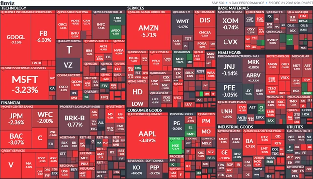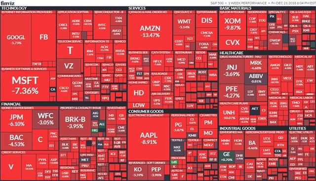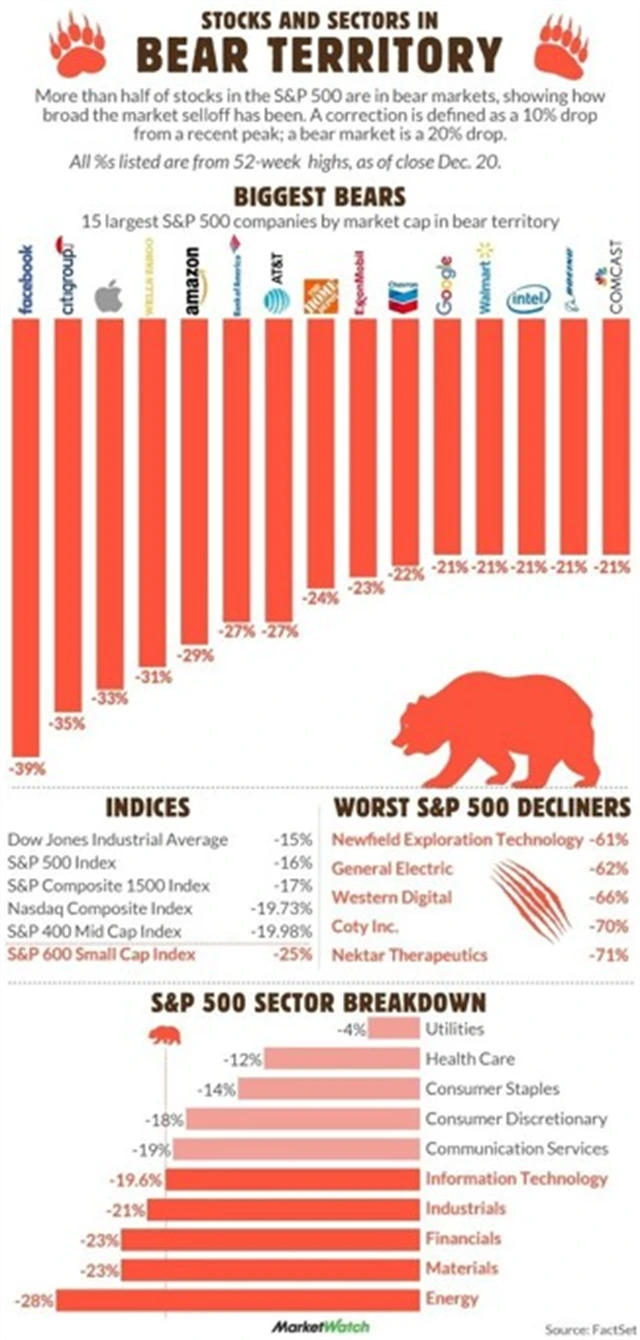 S&P 500, pro který bude letošní prosinec zřejmě nejhorším prosincem od Velké hospodářské krize, klesl na nejnižší úroveň od srpna 2017, Dow je nejslabší od října 2017 a Nasdaq spadl na 15měsíční minimum. Dow na předchozí zavírací maximum ztrácí 16,34 %, S&P 500 17,54 % a Nasdaq Composite 21,91 %.