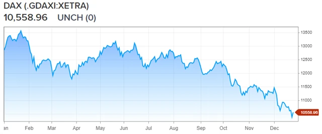 Německé akcie letos utrpěly nejprudší pokles od globální finanční krize z roku 2008, index DAX klesl o více než 18 % po předchozích šesti letech růstu. Frankfurtská burza letos byla pod tlakem mimo jiné kvůli sporům v mezinárodních obchodní vztazích a nejistotě kolem odchodu Británie z Evropské unie.